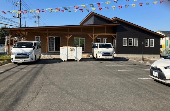 ブラックネイビーと木目調のブラウン、白枠格子の窓が