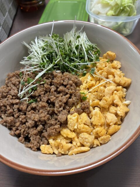 おいしそうなそぼろ弁当を食べている方がおりまして