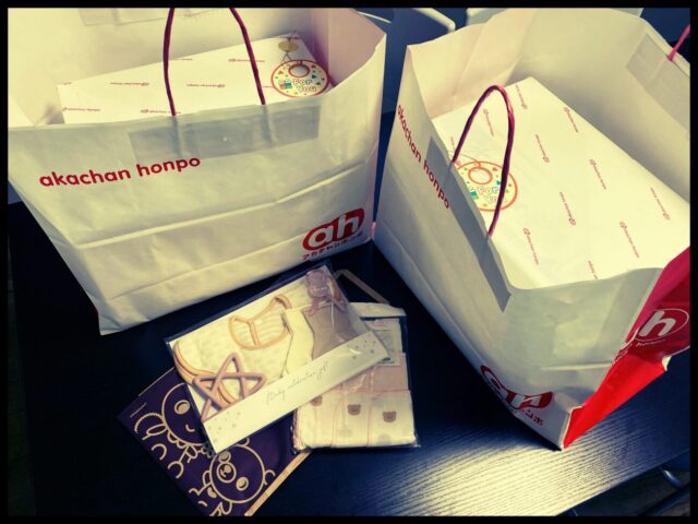 「アカチャンホンポ」の大きな袋と、