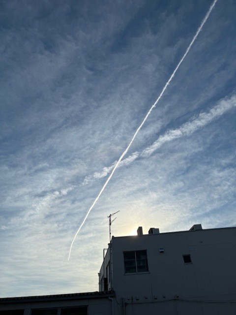 昨日の朝は飛行機雲が一直線に伸びる空でしたが