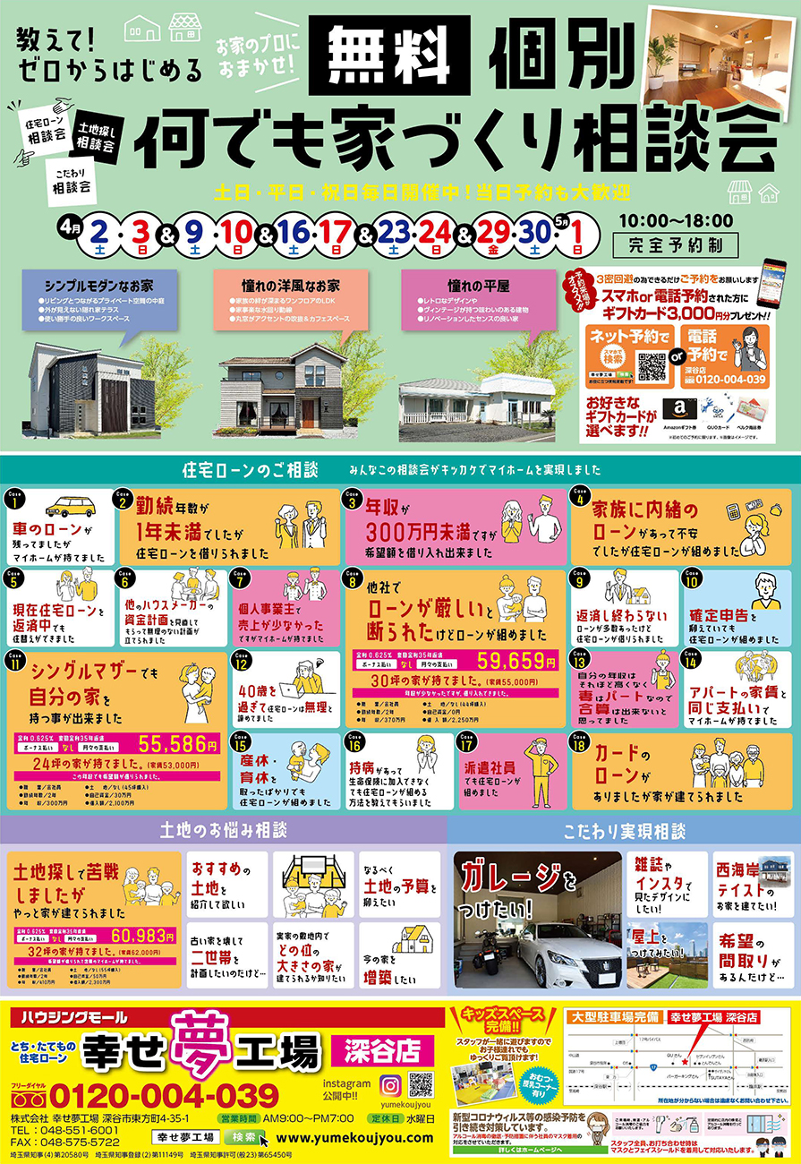 お家のプロにおまかせ!無料 個別 何でも家づくり相談会(深谷店) 4月2日(土)~5月1日(日) 開催時間 10:00~18:00 ご予約してからご来店するだけでお好きなギフトカード合計3,000円分プレゼント!! 幸せ夢工場 深谷店の地図 大きな地図で見る 幸せ夢工場のホームページにアクセスいただきありがとうございます!幸せ夢工場へのお問い合わせは、こちらのフォームから承っております。下のフォームに必要事項をご入力のうえ送信してください。のちほど担当よりご連絡させていただきます。 ★ご希望の時間で優先的にご対応させていただくため、事前の来店予約を承っております。 お名前必須 このフィールドは空のままにしてください。 メールアドレス必須 ご希望店舗必須 深谷店行田熊谷店CAZA−BASE熊谷店 ご希望日必須 ご希望時間必須 —以下から選択してください—AM9:00AM10:00AM11:00PM12:00PM1:00PM2:00PM3:00PM4:00PM5:00PM6:00以降 電話番号必須 郵便番号任意 半角入力 住所・番地必須 建物名ほか任意 ご来場のきっかけ必須 チラシ看板ホームページインスタグラム紹介してもらったご紹介者様名: ご相談・お問い合わせ任意 フォームの特性上、入力内容の確認画面は表示されません。このフォームにご入力いただく個人情報は、回答に必要な範囲でのみ使用し、それ以外の目的で使用することは一切ありません。個人情報の取扱いについて、プライバシーポリシーをご確認ください。 弊社は積極的に個人情報保護に取り組んでおります。こちらの希望条件につきましても個人情報としてお取り扱いさせていただきます。なお、希望条件登録のご送信をもちまして個人情報のご提供にご同意いただいたものと理解させていただきます。送りいただいた情報は以下の目的で使用させていただきます。 不動産の売買、賃貸、仲介、管理等の取引に関する契約の履行、及び情報、サービスの提供 上記1の利用目的の達成に必要な範囲での、個人情報の第三者への提供 当社が取り扱う商品に関する契約の履行、情報、サービスの提供 上記1、3の商品・情報・サービス提供のための郵便物、電話、電子メール等による営業活動、及びアンケートのお願い等のマーケティング活動。顧客動向分析または商品開発等の調査分析 情報、サービスの提供は、ご本人からの申出がありましたら取り止めさせていただきます 送信いただきました個人情報のお問合せまたは開示・訂正・削除のご請求は下記までご連絡ください。 幸せ夢工場 埼玉県深谷市東方町4-35-1 TEL:048-551-6001【営業時間】9:00~19:00【定休日】毎週水曜日弊社の会社情報はこちらプライバシーポリシーはこちら 上記の内容に同意する 来場予約特典につきましてはネットor電話にて初めてご予約される方限定となり、ご家族様・グループ様1回のみ、最大1万円(熊谷市・深谷市・行田市にお住まいの方は10,000円、各店舗所在地に隣接する地域、または当社指定地域にお住まいの方は5,000円)とさせて頂きます。当社主催のイベント及び店舗へ初めてご来場される方、モデルハウスまたはショールームをご見学のうえアンケートをご記入して頂いた方を対象とさせて頂きます。ご来場エリアや建築場所、建築時期、ご計画内容によりご来場特典をお渡しできない場合がございます。新築住宅をご検討して頂いている方の対象となり、リフォーム工事ご検討の方は対象外となります。当社規定により入居者様などのご紹介以外ですと対象外地域もありますのでご了承下さい。ご来場特典をお渡しさせて頂く際に、身分証を確認させて頂く場合がごさいますので予めご了承下さい。詳しくはお問い合わせください。 当日のご予約でご来場される方はお電話のみでのご予約の承りになりますので予めご了承下さい。ご予約状況によってはお電話にてご予約のご確認をさせて頂く場合がございますので、ご予約入力フォームには正確なご連絡先のご入力をお願い致します。 自動返信メールが届かないお客様は、大変お手数ではございますが、弊社までご連絡頂けますようお願いいたします。 キャリアメール(docomo、au、Softbank)の場合、弊社からの連絡が届かない可能性がございます。ドメインを受信許可設定いただくか、他のメールアドレスをご指定ください。