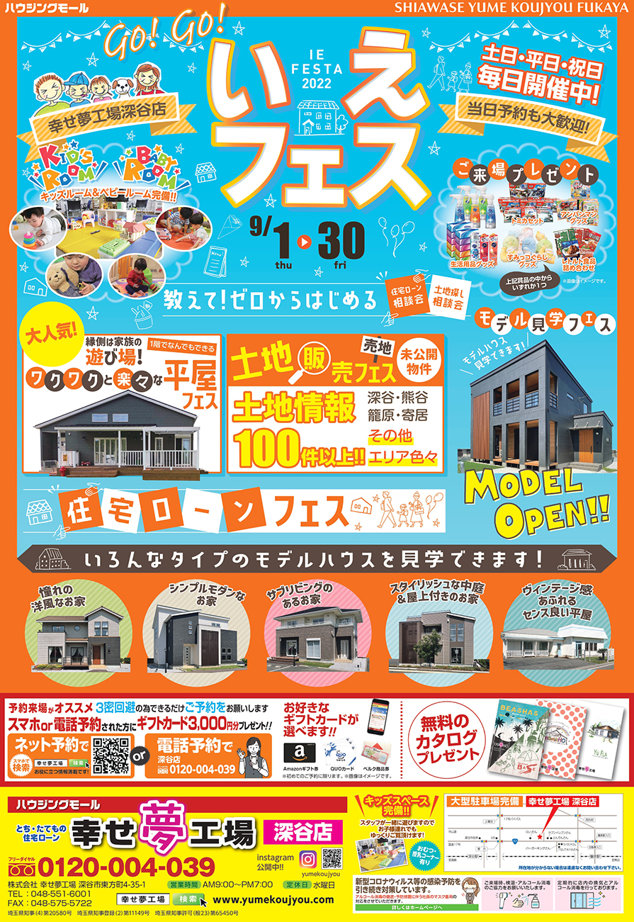 来場予約特典につきましてはネットor電話にて初めてご予約される方限定となり、ご家族様・グループ様1回のみ、最大1万円(熊谷市・深谷市・行田市にお住まいの方は10,000円、各店舗所在地に隣接する地域、または当社指定地域にお住まいの方は5,000円)とさせて頂きます。