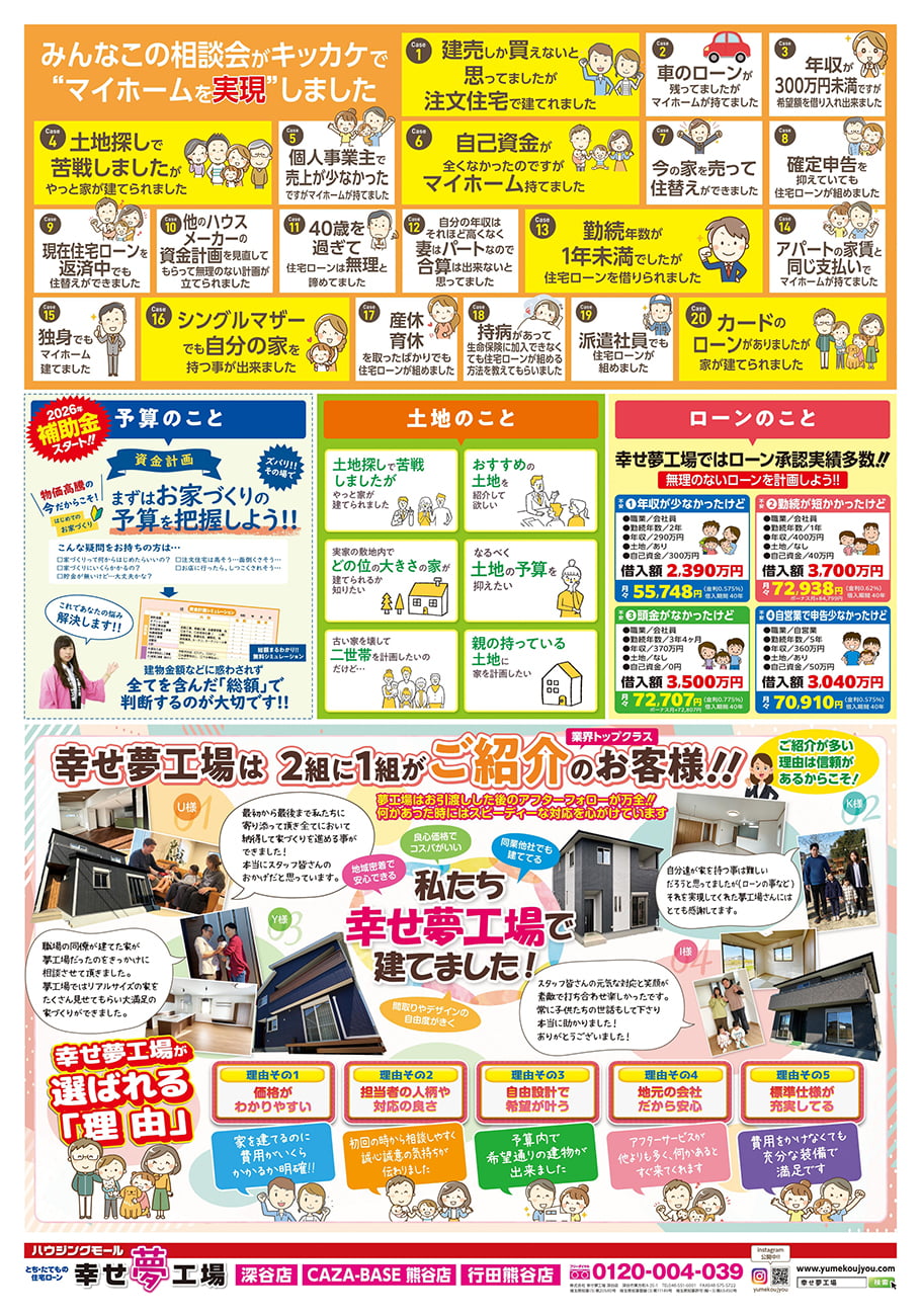 【3店舗同時開催】”予算内で妥協しない”家づくりフェア 2026年3月1日(日)~3月29日(日) 開催時間 10:00~18:00 幸せ夢工場 深谷店の地図 大きな地図で見る 幸せ夢工場 行田熊谷店の地図 大きな地図で見る 幸せ夢工場 CAZA−BASE熊谷店の地図 大きな地図で見る 幸せ夢工場のホームページにアクセスいただきありがとうございます!幸せ夢工場へのお問い合わせは、こちらのフォームから承っております。下のフォームに必要事項をご入力のうえ送信してください。のちほど担当よりご連絡させていただきます。 ★ご希望の時間で優先的にご対応させていただくため、事前の来店予約を承っております。 お名前必須 このフィールドは空のままにしてください。 メールアドレス必須 ご希望店舗必須 深谷店行田熊谷店CAZA−BASE熊谷店 ご希望日必須 ご希望時間必須 —以下から選択してください—AM9:00AM10:00AM11:00PM12:00PM1:00PM2:00PM3:00PM4:00PM5:00PM6:00以降 電話番号必須 郵便番号任意 半角入力 住所・番地必須 建物名ほか任意 ご来場のきっかけ必須 チラシ看板ホームページインスタグラム紹介してもらったご紹介者様名: ご相談・お問い合わせ任意 フォームの特性上、入力内容の確認画面は表示されません。このフォームにご入力いただく個人情報は、回答に必要な範囲でのみ使用し、それ以外の目的で使用することは一切ありません。個人情報の取扱いについて、プライバシーポリシーをご確認ください。 弊社は積極的に個人情報保護に取り組んでおります。こちらの希望条件につきましても個人情報としてお取り扱いさせていただきます。なお、希望条件登録のご送信をもちまして個人情報のご提供にご同意いただいたものと理解させていただきます。送りいただいた情報は以下の目的で使用させていただきます。 不動産の売買、賃貸、仲介、管理等の取引に関する契約の履行、及び情報、サービスの提供 上記1の利用目的の達成に必要な範囲での、個人情報の第三者への提供 当社が取り扱う商品に関する契約の履行、情報、サービスの提供 上記1、3の商品・情報・サービス提供のための郵便物、電話、電子メール等による営業活動、及びアンケートのお願い等のマーケティング活動。顧客動向分析または商品開発等の調査分析 情報、サービスの提供は、ご本人からの申出がありましたら取り止めさせていただきます 送信いただきました個人情報のお問合せまたは開示・訂正・削除のご請求は下記までご連絡ください。 幸せ夢工場 埼玉県深谷市東方町4-35-1 TEL:048-551-6001【営業時間】9:00~19:00【定休日】毎週水曜日弊社の会社情報はこちらプライバシーポリシーはこちら 上記の内容に同意する 来場予約特典につきましてはネットor電話にて初めてご予約される方限定となり、ご家族様・グループ様1回のみ、最大1万円(熊谷市・深谷市・行田市にお住まいの方は10,000円、各店舗所在地に隣接する地域、または当社指定地域にお住まいの方は5,000円)とさせて頂きます。当社主催のイベント及び店舗へ初めてご来場される方、モデルハウスまたはショールームをご見学のうえアンケートをご記入して頂いた方を対象とさせて頂きます。ご来場エリアや建築場所、建築時期、ご計画内容によりご来場特典をお渡しできない場合がございます。新築住宅をご検討して頂いている方の対象となり、リフォーム工事ご検討の方は対象外となります。当社規定により入居者様などのご紹介以外ですと対象外地域もありますのでご了承下さい。ご来場特典をお渡しさせて頂く際に、身分証を確認させて頂く場合がごさいますので予めご了承下さい。詳しくはお問い合わせください。 当日のご予約でご来場される方はお電話のみでのご予約の承りになりますので予めご了承下さい。ご予約状況によってはお電話にてご予約のご確認をさせて頂く場合がございますので、ご予約入力フォームには正確なご連絡先のご入力をお願い致します。 自動返信メールが届かないお客様は、大変お手数ではございますが、弊社までご連絡頂けますようお願いいたします。 キャリアメール(docomo、au、Softbank)の場合、弊社からの連絡が届かない可能性がございます。ドメインを受信許可設定いただくか、他のメールアドレスをご指定ください。