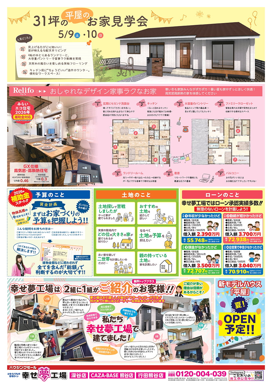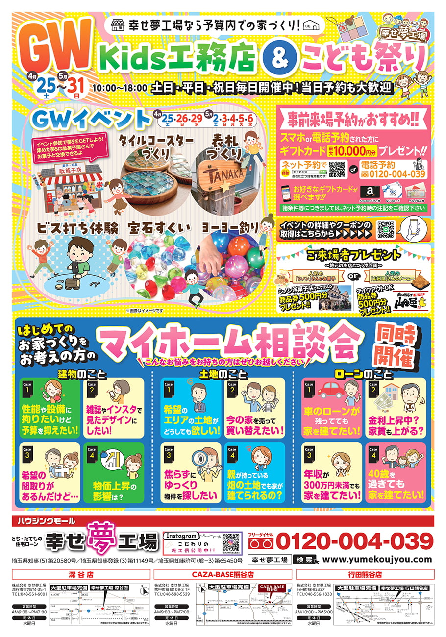 【3店舗同時開催】GW Kids工務店&こども祭り 2026年4月25日(土)~5月31日(日) 開催時間 10:00~18:00 幸せ夢工場 深谷店の地図 大きな地図で見る 幸せ夢工場 行田熊谷店の地図 大きな地図で見る 幸せ夢工場 CAZA−BASE熊谷店の地図 大きな地図で見る 幸せ夢工場のホームページにアクセスいただきありがとうございます!幸せ夢工場へのお問い合わせは、こちらのフォームから承っております。下のフォームに必要事項をご入力のうえ送信してください。のちほど担当よりご連絡させていただきます。 ★ご希望の時間で優先的にご対応させていただくため、事前の来店予約を承っております。 お名前必須 このフィールドは空のままにしてください。 メールアドレス必須 ご希望店舗必須 深谷店行田熊谷店CAZA−BASE熊谷店 ご希望日必須 ご希望時間必須 —以下から選択してください—AM9:00AM10:00AM11:00PM12:00PM1:00PM2:00PM3:00PM4:00PM5:00PM6:00 電話番号必須 郵便番号任意 半角入力 住所・番地必須 建物名ほか任意 ご来場のきっかけ必須 チラシ看板ホームページインスタグラム紹介してもらったご紹介者様名: ご相談・お問い合わせ任意 フォームの特性上、入力内容の確認画面は表示されません。このフォームにご入力いただく個人情報は、回答に必要な範囲でのみ使用し、それ以外の目的で使用することは一切ありません。個人情報の取扱いについて、プライバシーポリシーをご確認ください。 弊社は積極的に個人情報保護に取り組んでおります。こちらの希望条件につきましても個人情報としてお取り扱いさせていただきます。なお、希望条件登録のご送信をもちまして個人情報のご提供にご同意いただいたものと理解させていただきます。送りいただいた情報は以下の目的で使用させていただきます。 不動産の売買、賃貸、仲介、管理等の取引に関する契約の履行、及び情報、サービスの提供 上記1の利用目的の達成に必要な範囲での、個人情報の第三者への提供 当社が取り扱う商品に関する契約の履行、情報、サービスの提供 上記1、3の商品・情報・サービス提供のための郵便物、電話、電子メール等による営業活動、及びアンケートのお願い等のマーケティング活動。顧客動向分析または商品開発等の調査分析 情報、サービスの提供は、ご本人からの申出がありましたら取り止めさせていただきます 送信いただきました個人情報のお問合せまたは開示・訂正・削除のご請求は下記までご連絡ください。 幸せ夢工場 埼玉県深谷市東方町4-35-1 TEL:048-551-6001【営業時間】9:00~19:00【定休日】毎週水曜日弊社の会社情報はこちらプライバシーポリシーはこちら 上記の内容に同意する 来場予約特典につきましてはネットor電話にて初めてご予約される方限定となり、ご家族様・グループ様1回のみ、最大1万円(熊谷市・深谷市・行田市にお住まいの方は10,000円、各店舗所在地に隣接する地域、または当社指定地域にお住まいの方は5,000円)とさせて頂きます。当社主催のイベント及び店舗へ初めてご来場される方、モデルハウスまたはショールームをご見学のうえアンケートをご記入して頂いた方を対象とさせて頂きます。ご来場エリアや建築場所、建築時期、ご計画内容によりご来場特典をお渡しできない場合がございます。新築住宅をご検討して頂いている方の対象となり、リフォーム工事ご検討の方は対象外となります。当社規定により入居者様などのご紹介以外ですと対象外地域もありますのでご了承下さい。ご来場特典をお渡しさせて頂く際に、身分証を確認させて頂く場合がごさいますので予めご了承下さい。詳しくはお問い合わせください。 当日のご予約でご来場される方はお電話のみでのご予約の承りになりますので予めご了承下さい。ご予約状況によってはお電話にてご予約のご確認をさせて頂く場合がございますので、ご予約入力フォームには正確なご連絡先のご入力をお願い致します。 自動返信メールが届かないお客様は、大変お手数ではございますが、弊社までご連絡頂けますようお願いいたします。 キャリアメール(docomo、au、Softbank)の場合、弊社からの連絡が届かない可能性がございます。ドメインを受信許可設定いただくか、他のメールアドレスをご指定ください。
